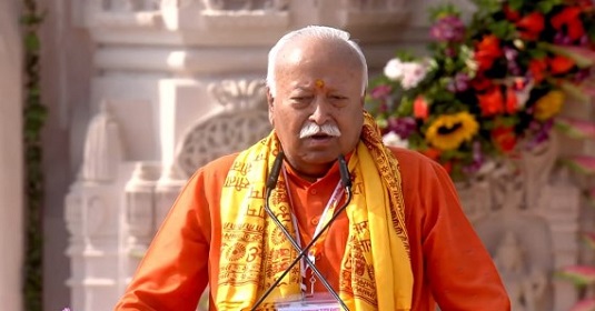 प्रधानमंत्री नरेन्द्र मोदी की उपस्थिति में श्रीराम जन्मभूमि मंदिर परिसर में आयोजित ध्वजारोहण समारोह को संबोधित करते हुए डॉ. भागवत ने कहा कि यह उसी रामराज्य का ध्वज है जो कभी अयोध्या में और पूरे विश्व में फहराता था, आज मंदिर पर फहराया है। इस भगवा ध्वज पर रघुकुल का प्रतीक कोविदार वृक्ष है। यह वृक्ष रघुकुल की सत्ता का प्रतीक है। यह वही वृक्ष है जिसके लिए कहा जाता है कि वृक्ष सबके लिए छाया देते हैं, लेकिन स्वंय धूप में खड़े रहते हैं। फल भी दूसरों के लिए देते हैं। रामराज्य का ध्वज यही संदेश देता है कि स्थितियां कितनी भी प्रतिकूल हों लेकिन उसे अपने धैर्य के साथ अनुकूलता में बदलना है और आज हिंदू समाज ने राम मंदिर के लिए 500 साल तक संघर्ष करके दिखा दिया है। इसी सत्य पर आधारित धर्म दुनिया को देने वाला भारत आज खड़ा हो गया है। आज अयोध्या पूरी दुनिया का सांस्कृतिक चेतना का केंद्र बन रही है और पूरी दुनिया राममय है। यह धर्मध्वज ही नहीं अपितु भारत के पु्नर्जागरण का प्रतीक भी है और इसका भगवा रंग सदियाें के संकल्प का प्रतीक है।