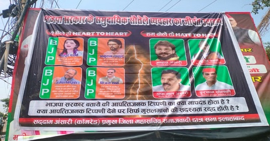 पोस्टर में भाजपा नेता सांसद अनुराग ठाकुर, मध्य प्रदेश के मंत्री विजय शाह, पूर्व सांसद रमेश बिधूड़ी और भाजपा नेता नुपुर शर्मा का चित्र लगा है जबकि दूसरी तरफ सपा नेता आजम खां, अफजाल अंसारी, इरफान सोलंकी और अब्बास अंसारी का चित्र लगा है। सपा के छात्रनेता सद्दाम अंसारी कामरेड अंसारी की ओर से लगाए गए इस पोस्टर में लिखा गया है कि भाजपा बताए कि आपत्तिजनक टिप्पणी का मानदंड क्या होता है। क्या आपत्तिजनक टिप्पणी करने पर सिर्फ मुसलमानों की सदस्यता रद्द होती है।